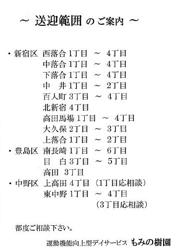 東京都新宿区. たに誕生します☆ 歌やお遊戯を行う従来のデイサービスとは異なり、 日常生活訓練のリハビリを行うことでご利用者様が ”みるみる元気になり笑顔が増えた♪” とご...費規定内支給 写真をクリックすると上の写真が切り替わります。 <高田馬場駅 ... |